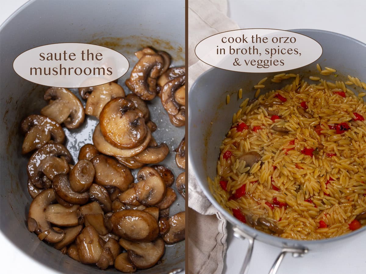 - To the same pot with half of cooked mushrooms, add uncooked orzo, roasted red peppers, vegetable broth, minced garlic, dried thyme, and smoked paprika.