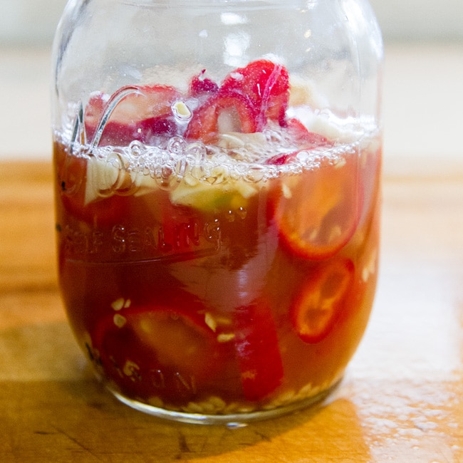 - In a large jar, combine the sliced chiles (and seeds), garlic, salt, and cider vinegar. Screw the lid on and give a few little shakes to mix. Leave the mixture to sit on the counter overnight.