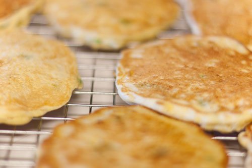 - Set a large non-stick frying pan or a large griddle over medium heat, and add 1 tablespoon oil. Scoop ¼-cup portions of batter into pan. Cook, turning once, until puffed and golden brown, about 6 minutes total. As the cooked cakes come off the griddle, set them on a cooking rack.