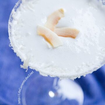 The Winter White Coconut Cocktail to help celebrate the short days and chilly nights of winter. This Cocktail is the best of winter, in a pretty glass!